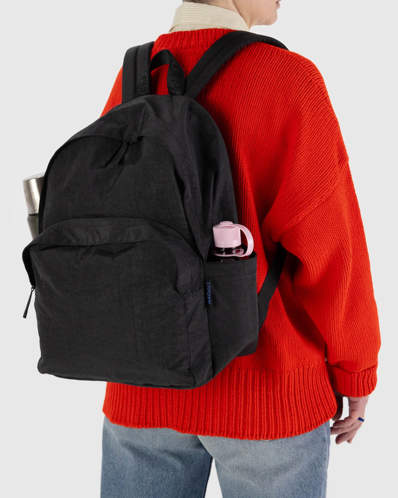 Fits anything you need for work, school, or an overnight trip. Interior laptop sleeve with velcro closure that fits 16” laptop in puffy case. Padded back and two exterior water bottle holders. Lightweight, durable construction with padded, adjustable straps. Machine wash cold.