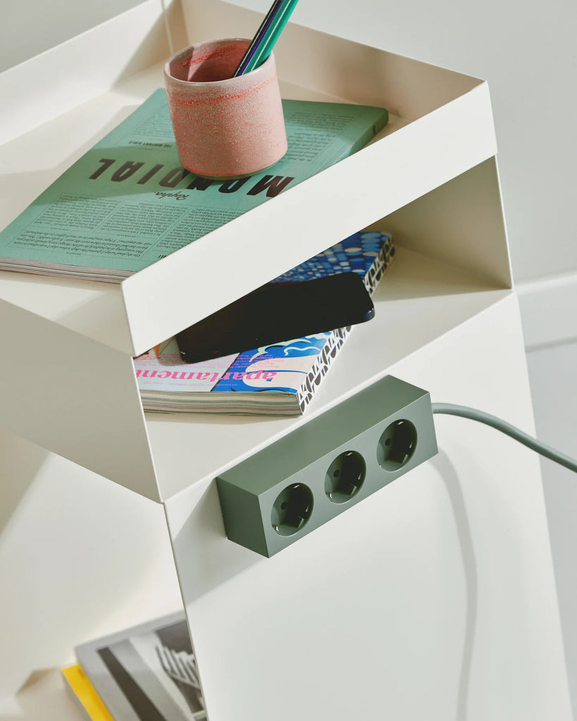Power Bar is a power strip with 3 outlets and a flexible 2-meter-long cable with an exclusive matte finish. Power Bar is equipped with strong magnets that snaps to your Pedestal or other magnetic surfaces.