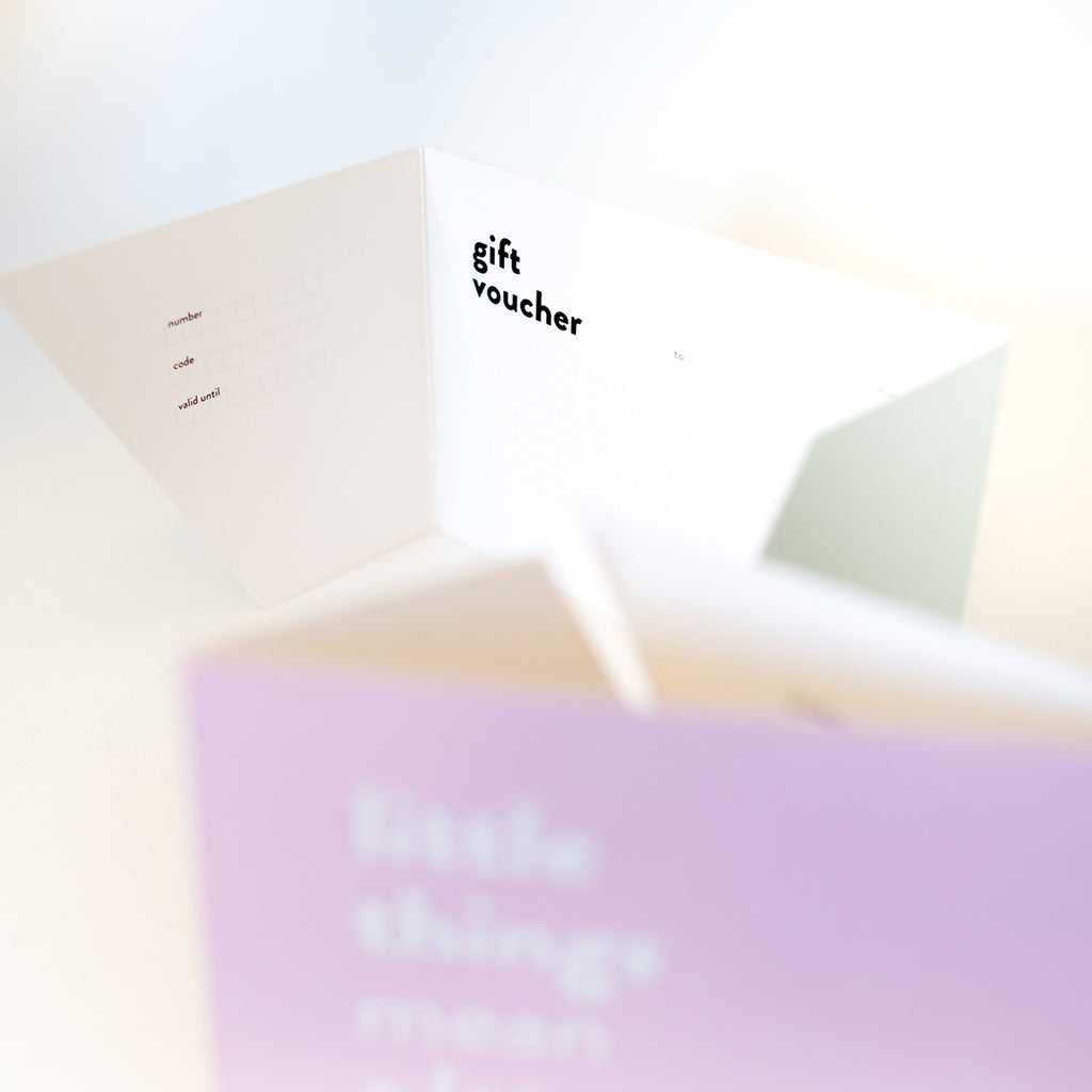 You can choose between a pink one or a blue one and we'll send the pysical gift card to your home! Or you can choose to pick it up in our store.