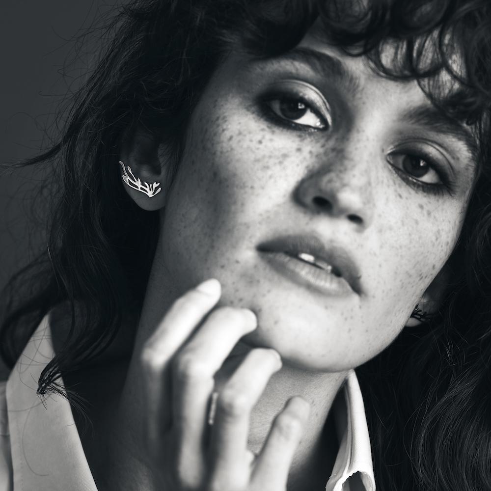 Thin climbers earrings (which go up along the lobe) gilded with fine gold. They can also be worn vertically. They mimic the long, many stamens of the Ohia flower that grows in lava fields in Hawaii. The earrings are extremely delicate and subtly follow the shape of the ear
