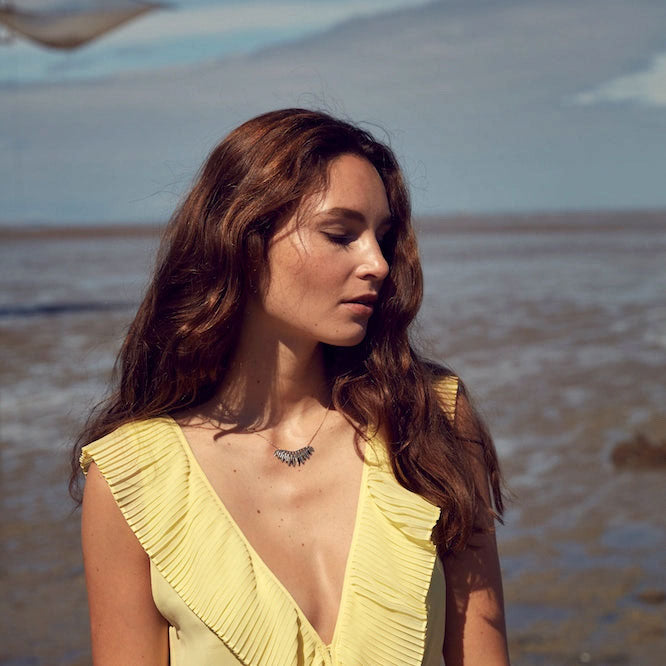• Necklace gilded with fine openwork gold, with a finely engraved and enamelled plumage pattern. Neither too small nor too big, the necklace has a very pretty bright and colorful presence on the chest.