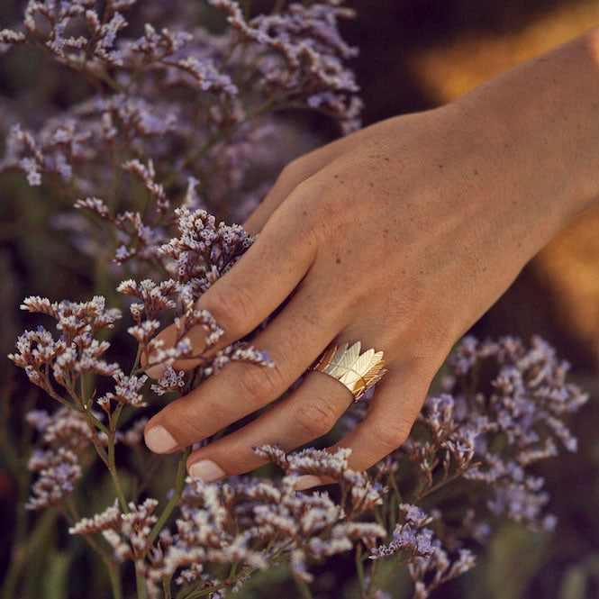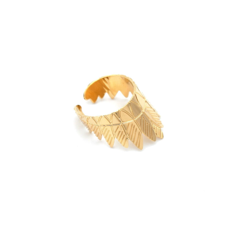 • Adjustable 3 micron gold-plated ring composed of a finely engraved plumage pattern. This unusual ring hugs the shape of the finger and combines elegance, strength and femininity at the same time. It has character while bringing a bohemian spirit.