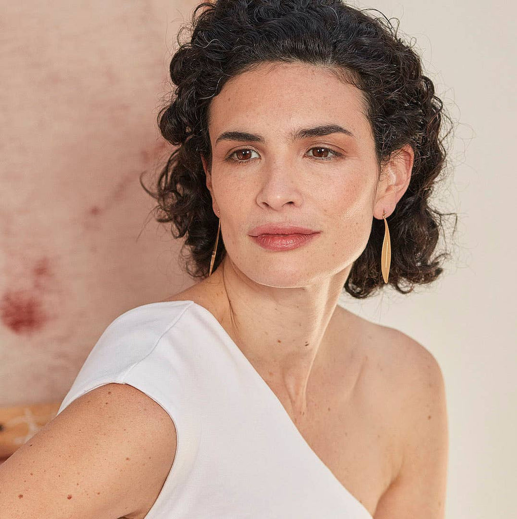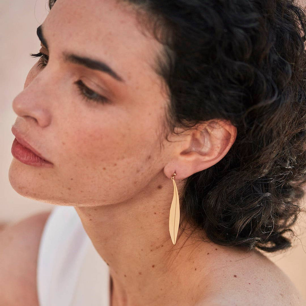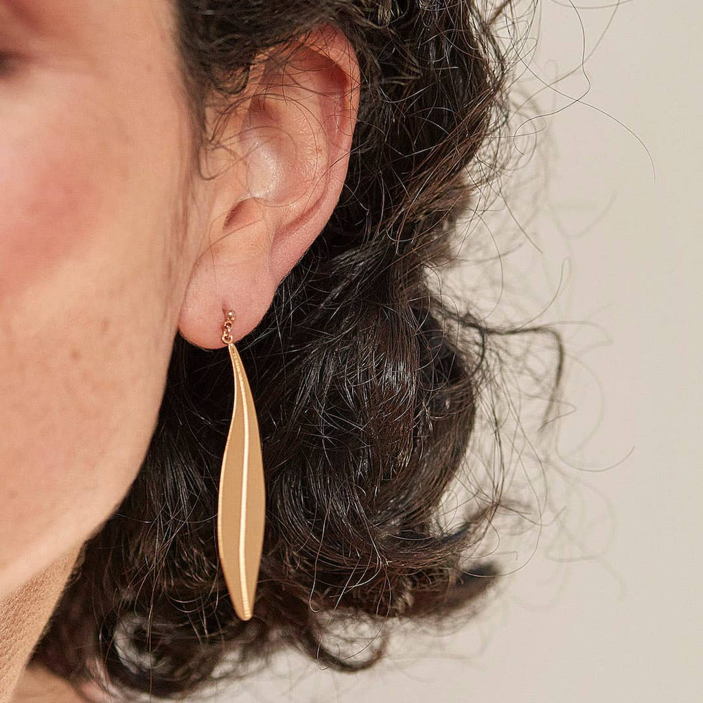 • Long dangling earrings whose pattern is inspired by the oblong leaves of Euphorbia, a generous and resistant plant from the Charente coast.