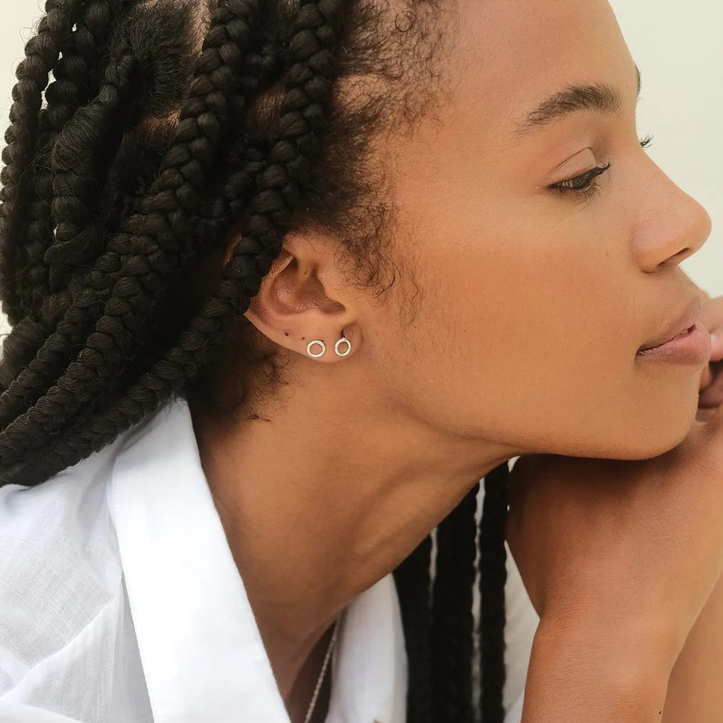 Introducing our stunning collection of sterling silver jewellery, minimal, timeless, and elegant. The Silver Mini circle earrings are very graphic, light and have a natural elegance. The artisan crafts each piece from the highest quality sterling silver, making it the perfect choice for those who appreciate understated luxury.