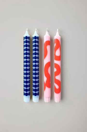 Our candle collection includes a selection of four different colors and two graphic patterns. They have the same dimensions as classic candles, making them perfect for any standard candleholder. You can mix and match our candles for a creative vibrant look and combine them with one of the 4 WAVE candleholder colors for a harmonious match in color and pattern. Or use them in one of the 4 LINK candle holders for a more stylish and simple look.