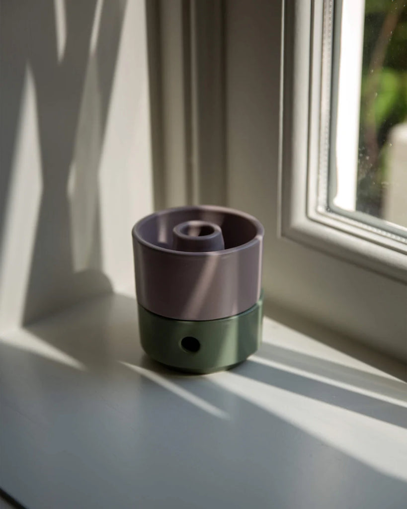 Breng sfeer en ontspanning in huis met deze aroma diffuser, gemaakt van 90% gerecyclede klei. Het ontwerp bestaat uit twee delen: het onderste deel met een XL waxinelichtje en het bovenste deel waarin je water en essentiële olie kunt toevoegen.