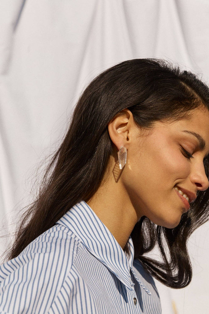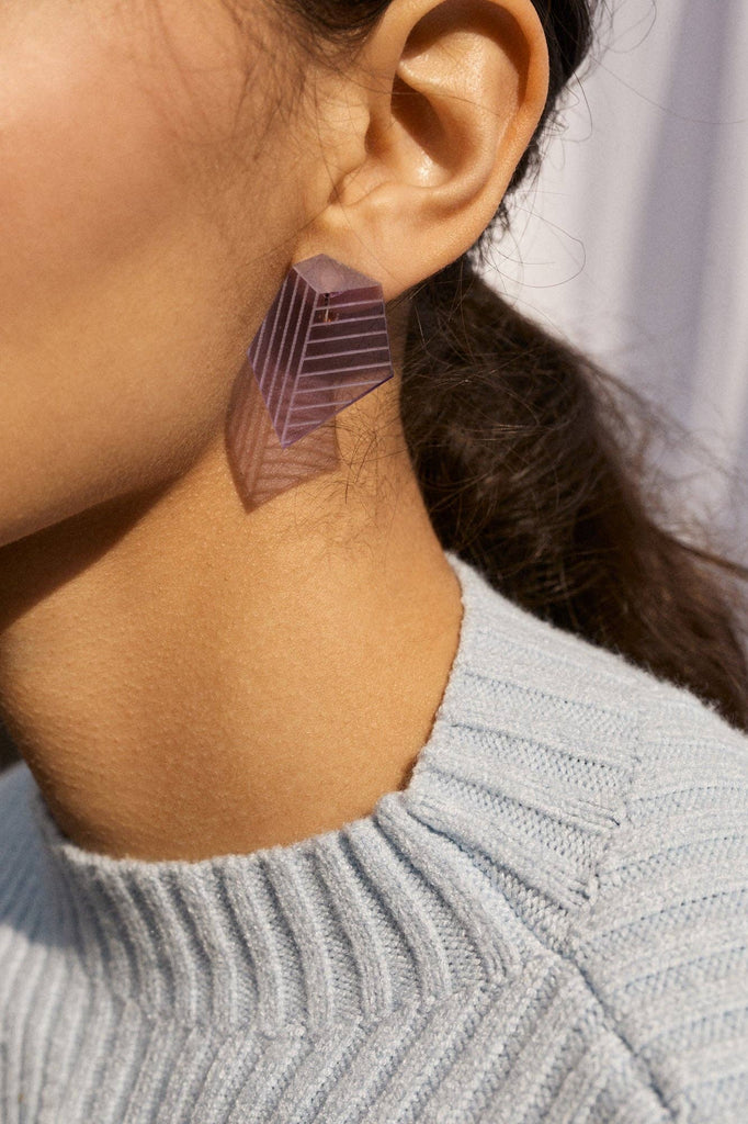 Plexiglass piece: 35 x 25 x 3 mm. Gold-plated fastenings and clasps. Available in emerald green, ocean blue, lilac, and transparent.